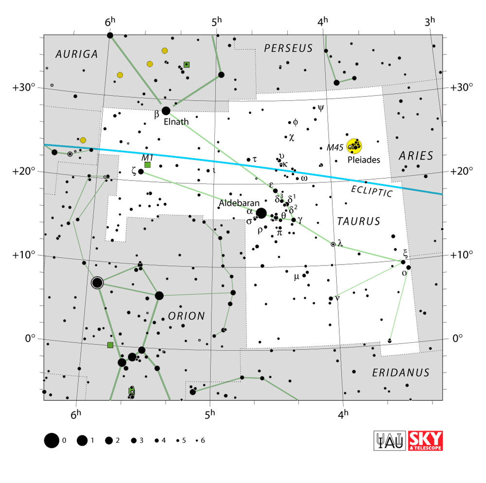 Taurus contains two Messier objects – Messier 1 (M1, NGC 1952, Crab Nebula) and Messier 45 (the Pleiades) – and has five stars that may have planets in their orbits. The brightest star in the constellation is Aldebaran, Alpha Tauri, with an apparent magnitude of 0.85. Aldebaran is also the 13th brightest star in the sky.
