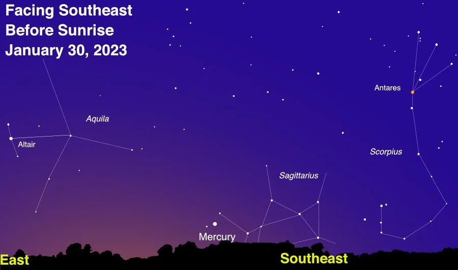Mercury reaches maximum western elongation on the morning of January 30, which means that your best chance to spot it is right before sunrise that day! Look for Mercury towards the southeast and find the clearest horizon you can. Observers located in more southern latitudes of the Northern Hemisphere have an advantage when observing Mercury as it will be a bit higher in the sky from their location, but it’s worth a try no matter where you live. Binoculars will help pick out Mercury’s elusive light from the pre-dawn glow of the Sun. Image created with assistance from Stellarium