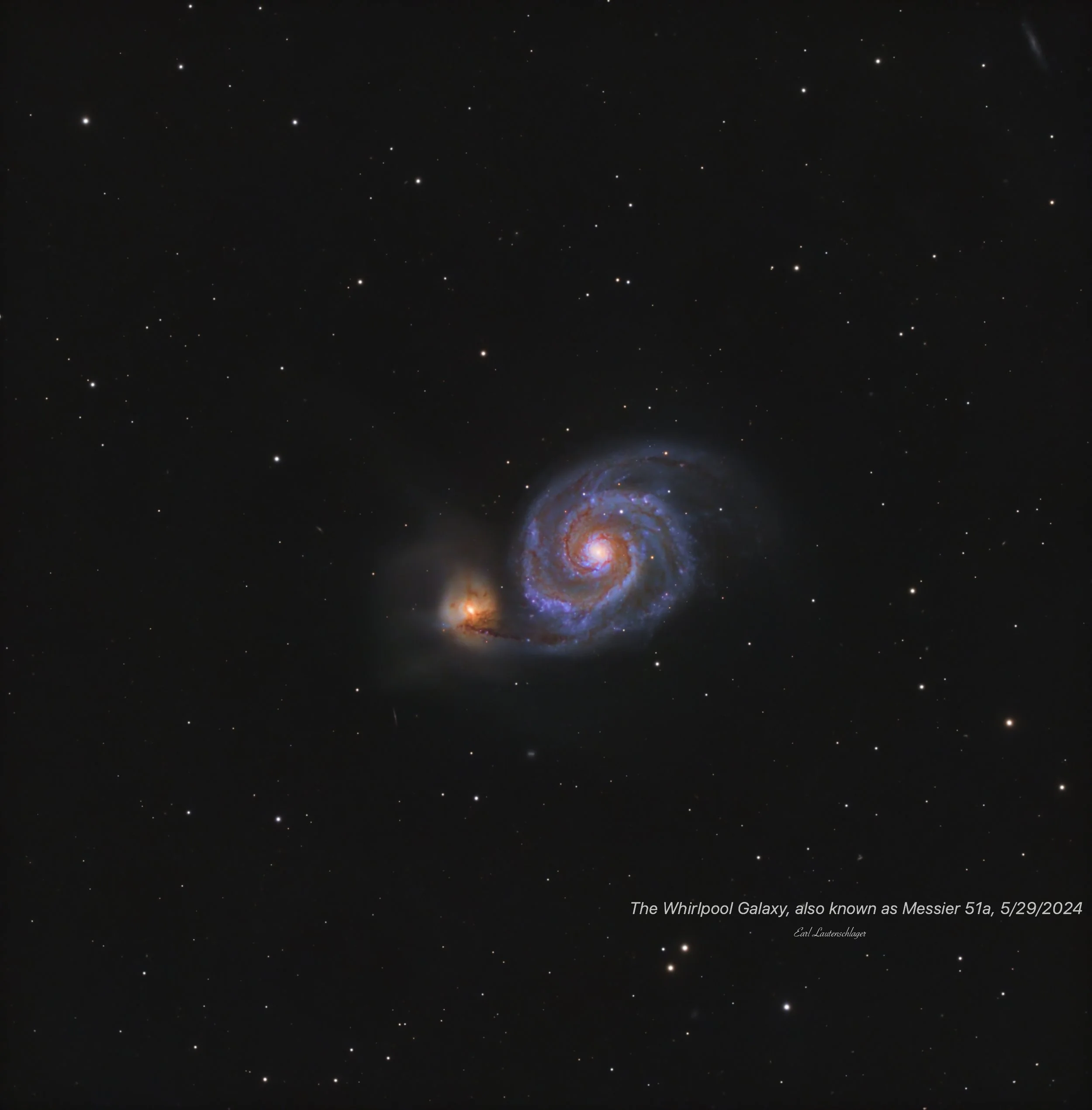 Discovered by Charles Messier in 1773, M51 (M51a) is located 31 million light-years from Earth in the constellation Canes Venatici, but is easily found under Alkaid of Ursa Major, Big Dipper handle. It has an apparent magnitude of 8.4 and can be spotted with a small telescope most easily during May. The Whirlpool galaxy’s beautiful face-on view and closeness to Earth allow astronomers to study a classic spiral galaxy’s structure and star-forming processes.