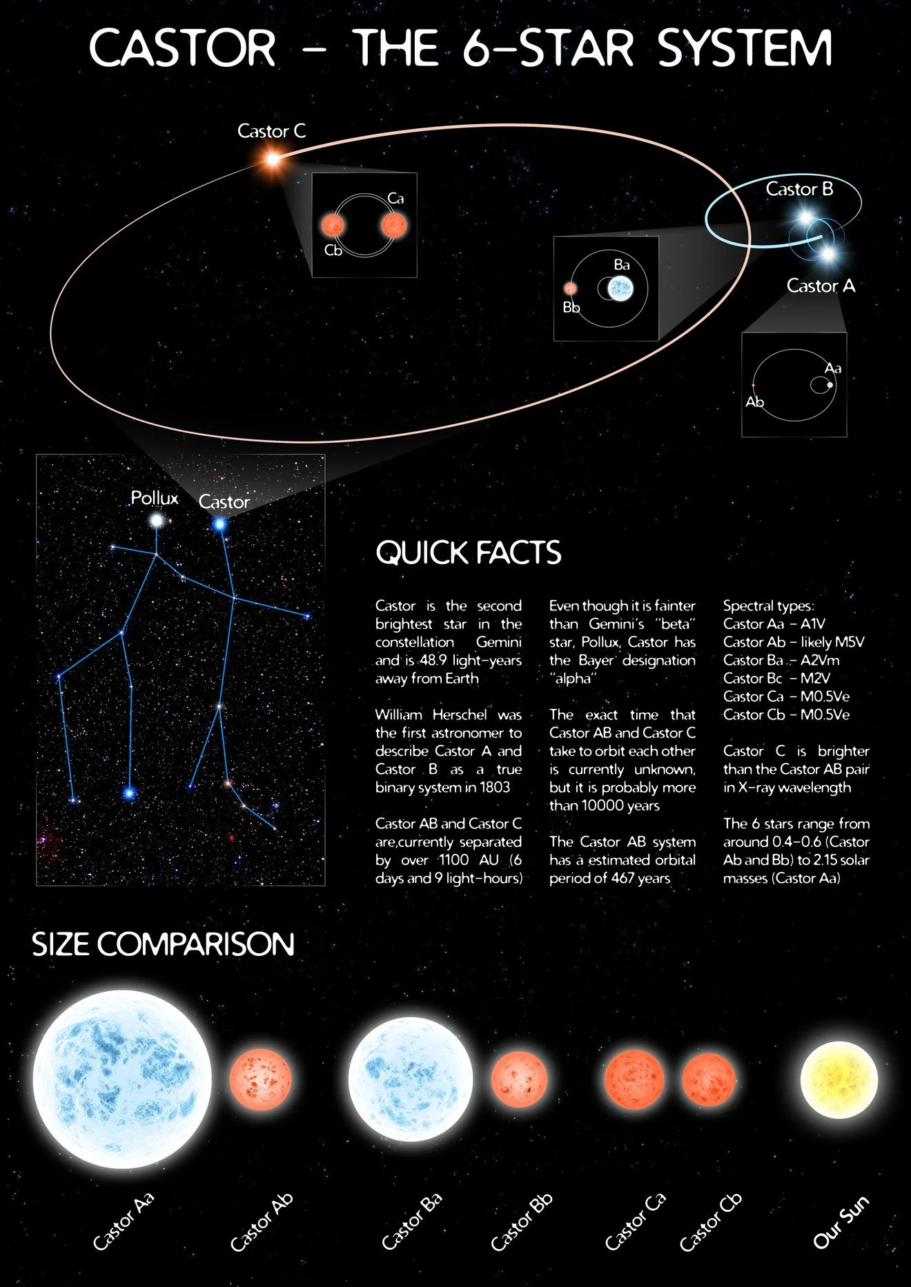Castor is a group of six stars that looks like a single white star to the naked eye. Castor is the second-brightest star in the constellation Gemini and one of the brightest in the night sky, located about 51 light-years from Earth. Although it appears as a single star, it is actually a complex sextuple system composed of three pairs of binary stars (Castor A, B, and C). It is often paired with the brighter star Pollux.