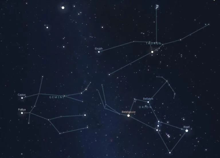 Gemini, the Twins. This constellation can be seen in the winter sky, along with neighboring constellations Orion and Taurus. Best seen in January to March. Tracing from Mintaka in Orion's Belt to Betelgeuse, a massive red supergiant marking the left shoulder. Go beyond Betelgeuse will take you through Gimini until you reach the twins Castor and Pollux.