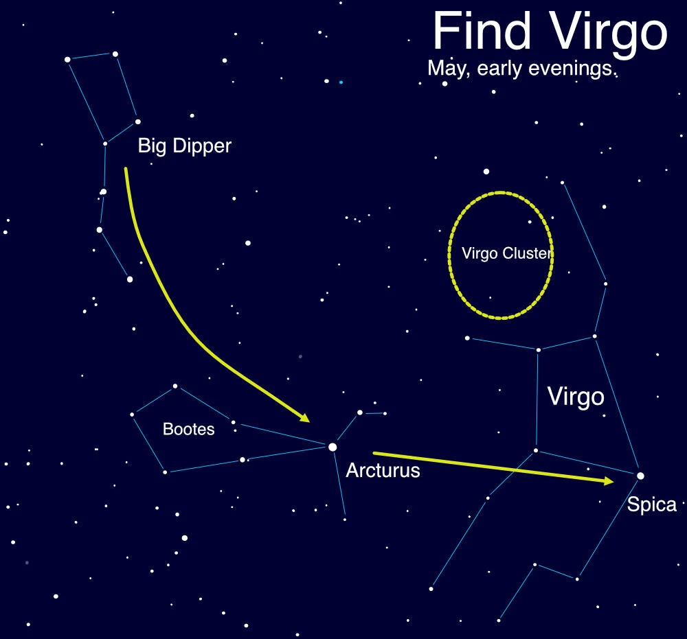 Find Virgo by “arcing to Arcturus, then spiking on to Spica.” Please note that in this illustration, the location of the Virgo Cluster is approximate - the borders are not exact.