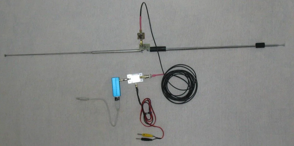 Equipment used by Reddit user Maxworm to detect Perseids meteors using the Graves radar: Dipole, LNA, Bias-Tee, and RTL-SDR. Article for this setup can be found at RTL-SDR.COM