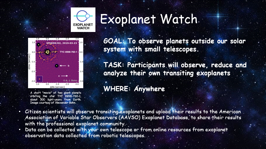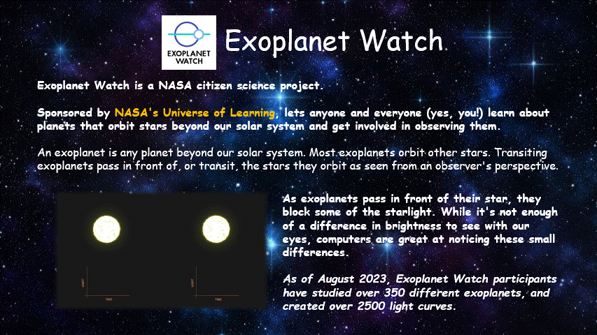 A planet passing in front of its parent star creates a drop in the star’s apparent brightness, called a transit. Exoplanet Watch participants can look for transits in data from ground-based telescopes, helping scientists refine measurements of the length of a planet's orbit around its star. Credit: NASA’s Ames Research Center
