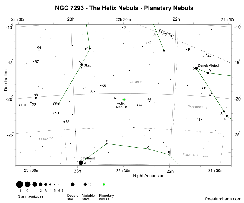 NGC 7293 is a large and well-known planetary nebula located in the faint zodiac constellation of Aquarius. Also known as Caldwell 63, it's one of the nearest objects of its type and a beautiful example of a remnant of a dying star. It contains a double ring structure, not unlike two coils of a spring, hence the popular name the Helix Nebula.