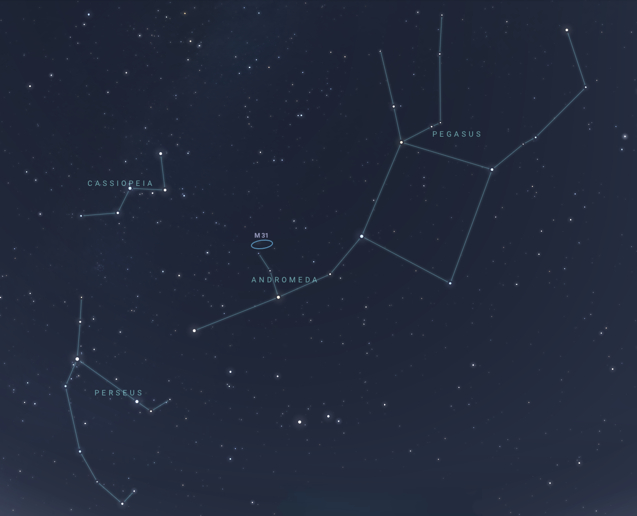 Spot the Andromeda Galaxy! M31’s more common name comes from its parent constellation, which becomes prominent as autumn arrives in the Northern Hemisphere. Surprising amounts of detail can be observed with unaided eyes when seen from dark sky sites. Hints of it can even be made out from light-polluted areas. Use the Great Square of Pegasus or the Cassiopeia constellation as guides to find it. Credit: Stellarium Web