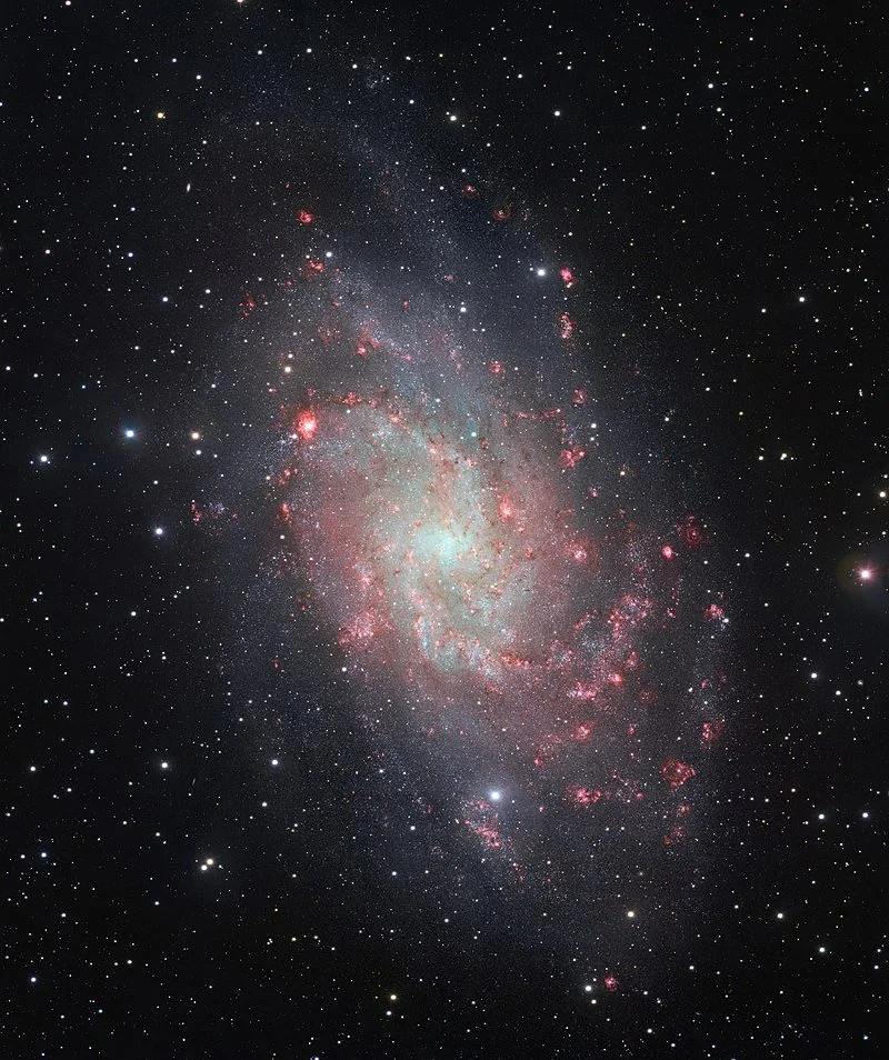 The galaxy is best seen from Northern Hemisphere locations during October, November, and December. Under dark skies. Binoculars reveal a large mist without detail. An 80mm (3.1-inch) scope shows the galaxy as a very large diffuse patch of light, covering much of the field of view with a slightly brighter center that's best viewed using low powers. A medium-size 150mm (6-inch) or 200mm (8-inch) scope enhances the core and brings out some mottling. A larger telescope of at least 300mm (12-inch) aperture is required to reveal the spiral structure, along with dark dust lanes, knotty patches of nebulosity, and other subtle features. For the budding astrophotographer, M33 is a rewarding target with spiral arms and brighter nebulae relatively easy to capture.