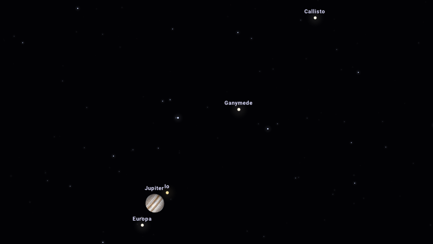 The Jovian system: Europa, Io, Ganymede, and Callisto. Credit: Stellarium Web
