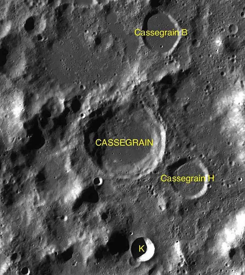 The 55 km diameter lunar impact crater Cassegrain, is located to the southeast of the larger crater Lebedev on the far side of the Moon and seen here immediately to the lower right of the image center, is named in his honor.