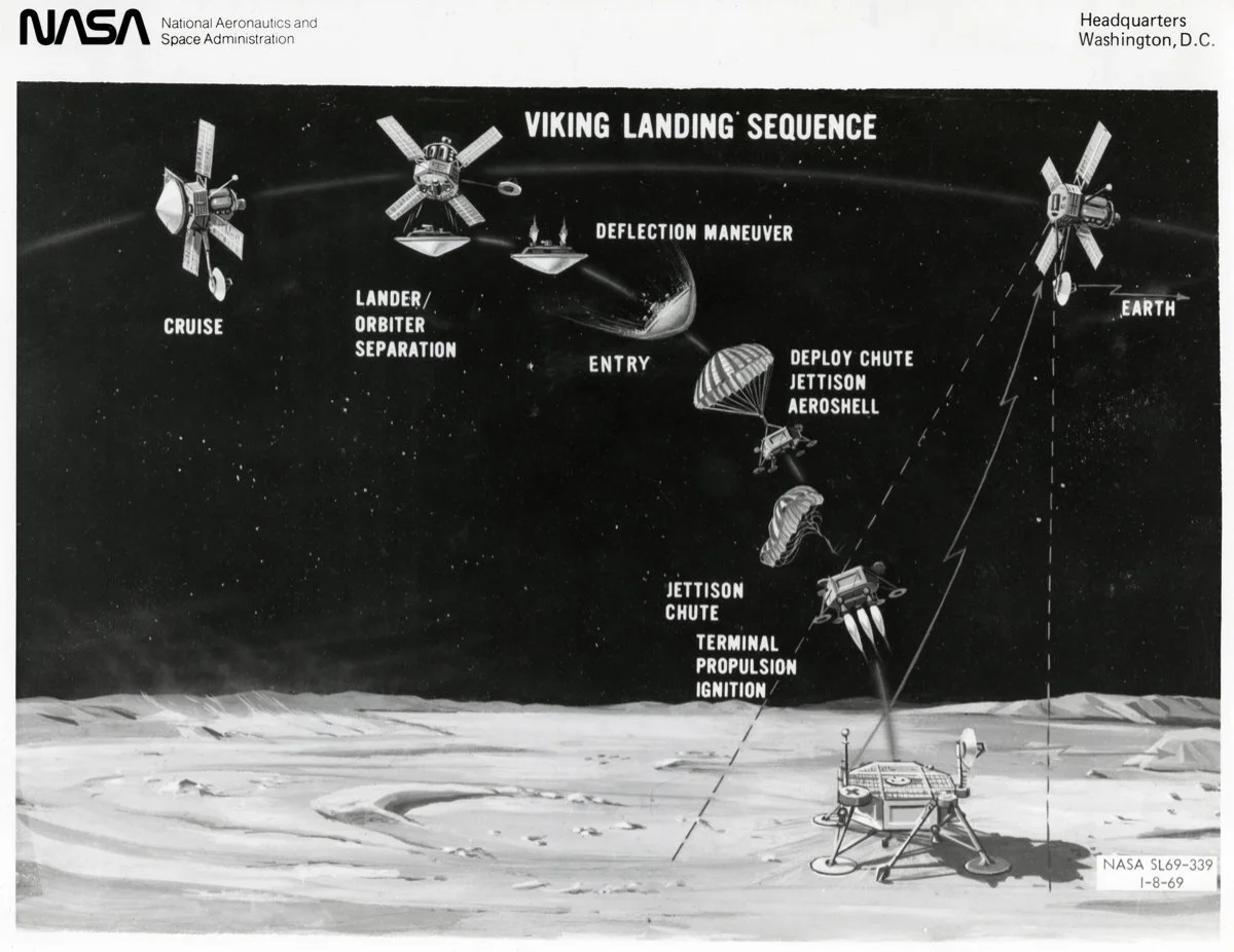 Illustrations of the Entry, Descent, and Landing (EDL) sequences for Viking in 1976 (below), and Perseverance in 2021 (above). Despite the wide gap between these missions in terms of technology, they both performed their landing maneuvers automatically, since our planets are too far apart to allow Earth-based engineers to control them in real time! (NASA/JPL/Caltech)